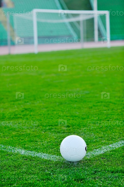 Белый мяч на траве футбольного поля