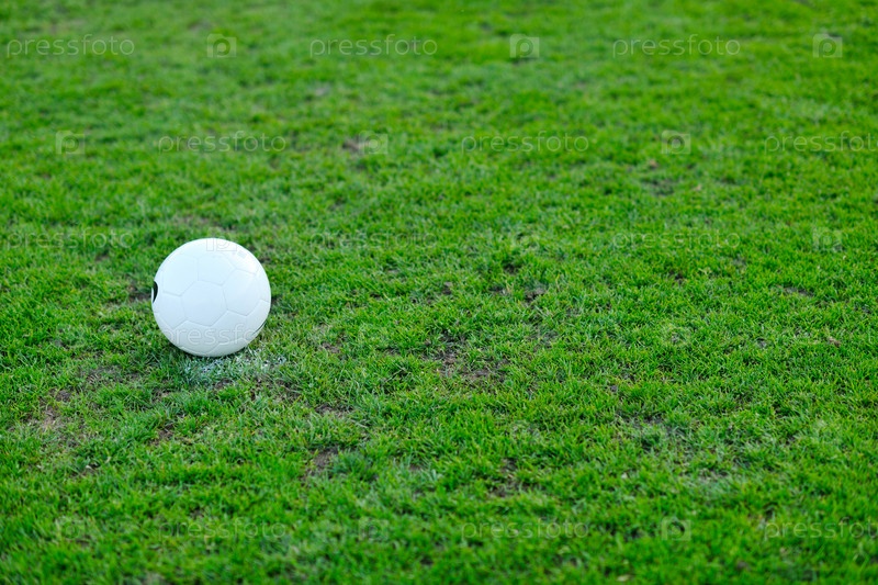 Белый футбольный мяч лежит на траве