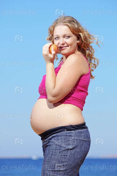 Портрет беременной женщины на фоне синего неба