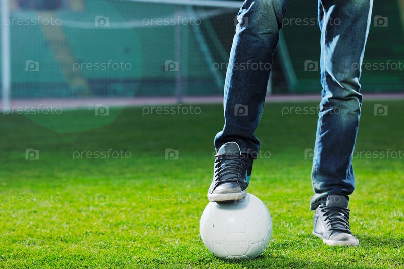Мужчина с мячом на футбольном поле стадиона