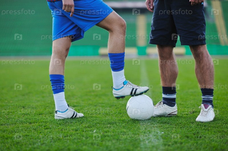 Футбольные игроки разговаривают на футбольном поле стадиона