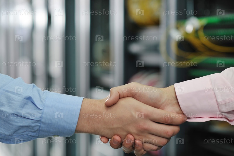 ИТ-инженеры в серверной комнате пожали друг другу руки.Концепция помощи и решения проблем