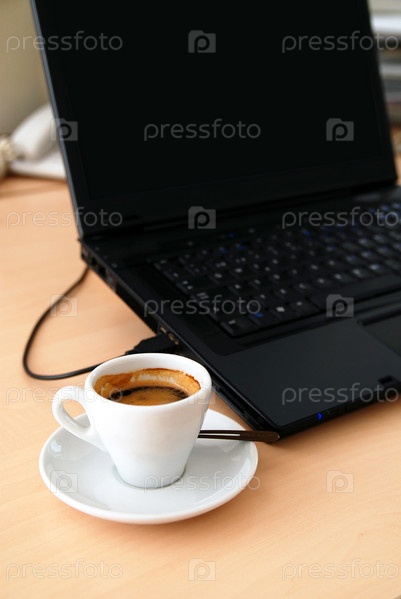Утренний кофе рядом с ноутбуком в офисе