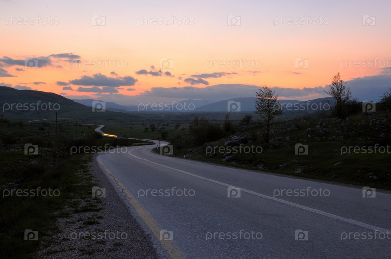 Красивый закат, живописные облака и сельская дорога, манящая приключениями