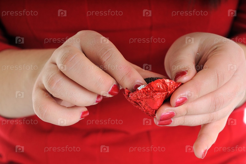 Женщина разворачивает конфету