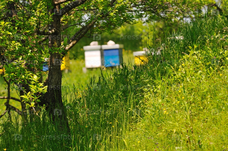 Пчелиные ульи на весеннем лугу со свежей травой и цветами