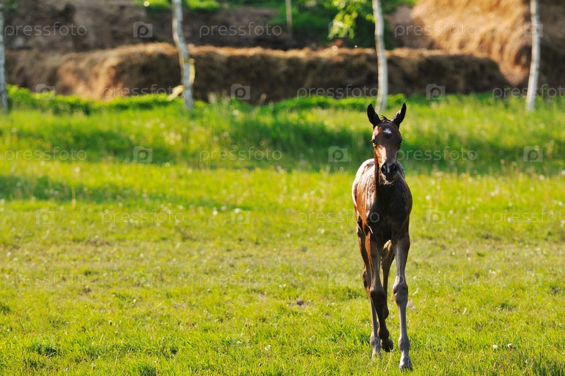 Красивый жеребенок резвится на пастбище