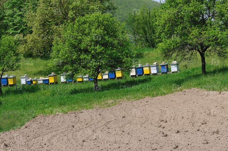 Пчелиные ульи на весеннем лугу со свежей травой и цветами