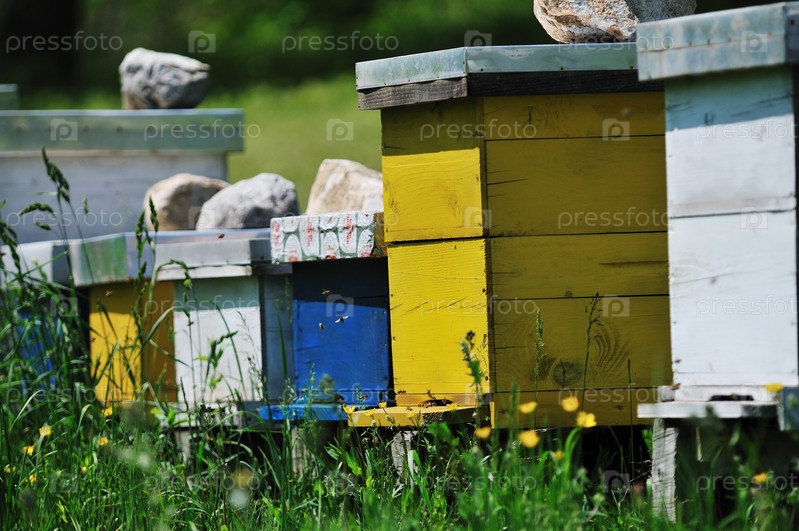 Пчелиные ульи на весеннем лугу со свежей травой и цветами