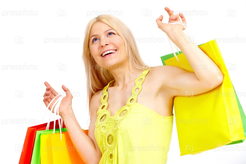 Молодая девушка с разноцветными пакетами в руках на белом фоне
