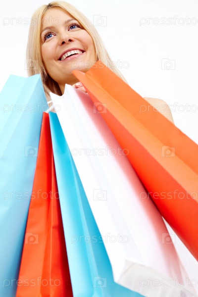 Молодая девушка с разноцветными пакетами в руках на белом фоне
