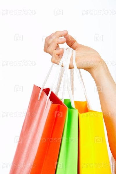 Рука держит разноцветные пакеты на белом фоне