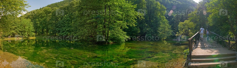 Молодая пара идет по деревянному мосту