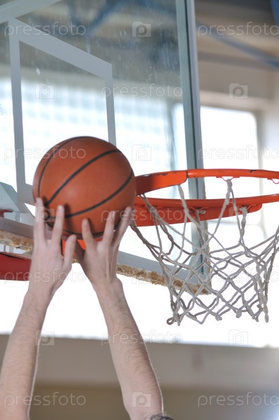Корзина и руки баскетболиста, играющего в школьном спортивном зале