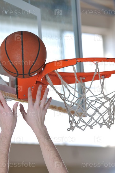 Корзина и руки баскетболиста, играющего в школьном спортивном зале