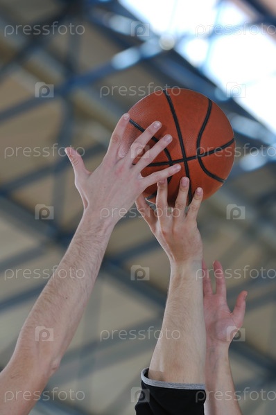 Корзина и руки баскетболистов, играющих в школьном спортивном зале