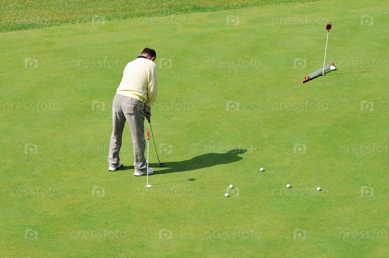 Мужчина играет в гольф на траве