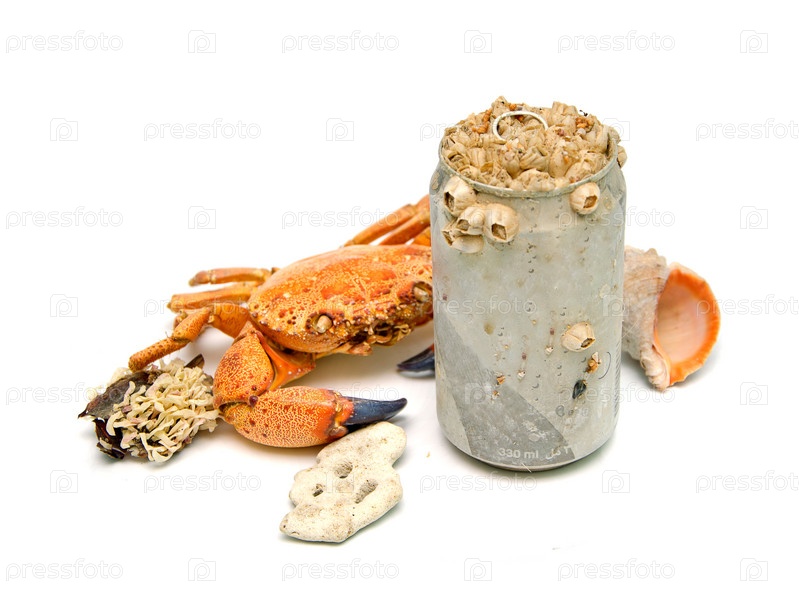 Металлическая бутылка, заросшая морскими ракушками и чучело краба на белом фоне