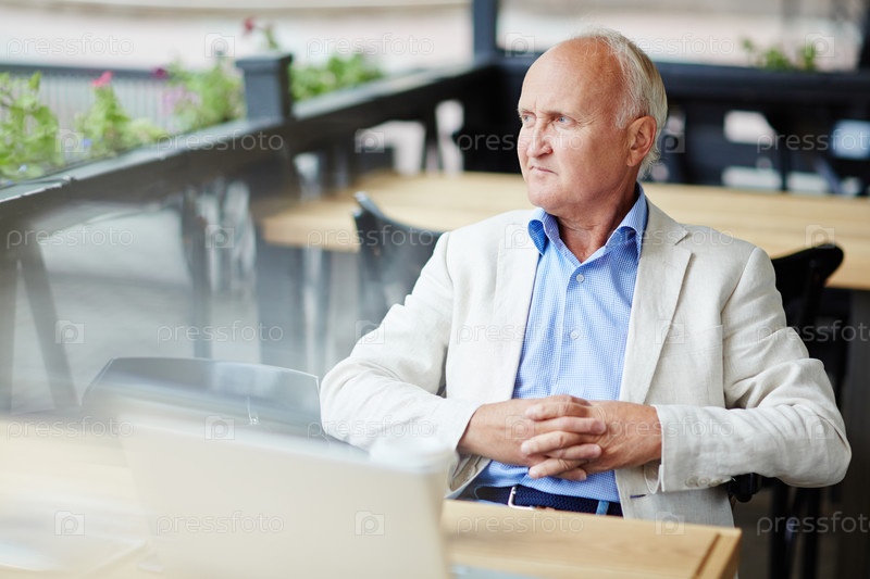 Задумчивый пожилой мужчина в открытом кафе