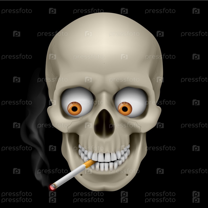 Человеческий череп с глазами и сигаретой в зубах. Иллюстрация на черном фоне