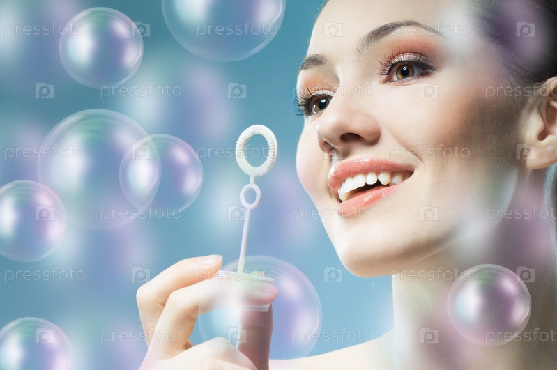 Красивая молодая женщина, вдыхающая мыльные пузыри