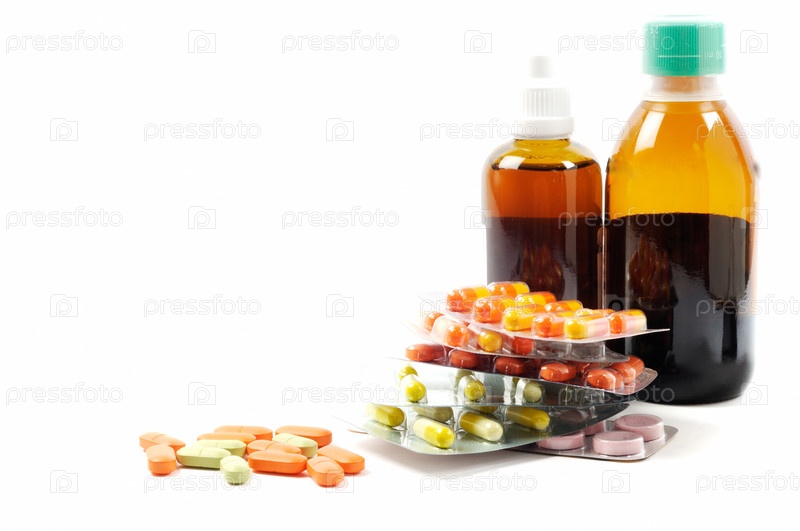 Таблетки, бутылочки и блистеры на белом фоне