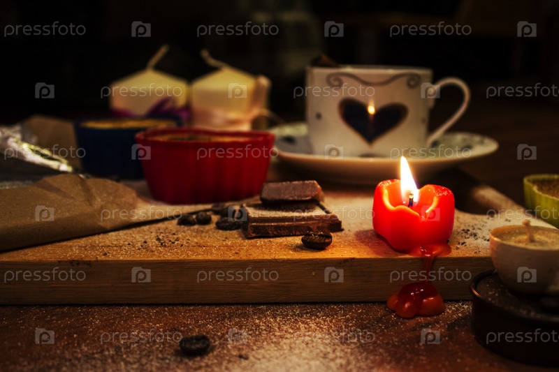 Горящая свеча и кофе. Романтический ужин