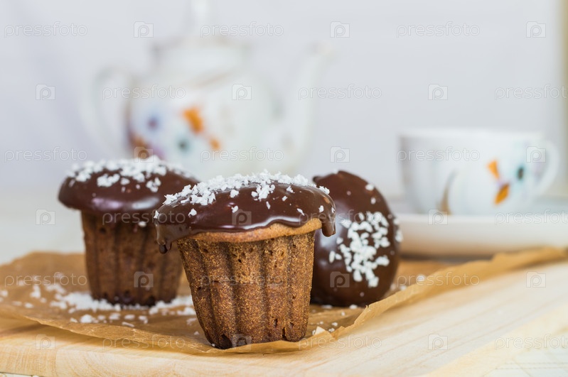Три шоколадных кекса с глазурью и кокосовой струшкой