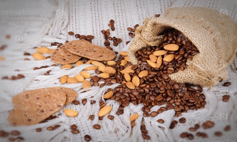 Мешок с кофейными зернами, миндаль и печенье