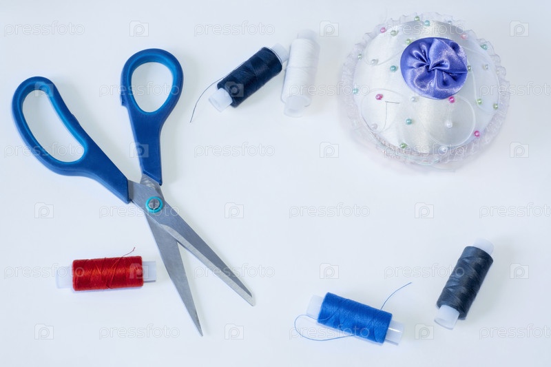 Ножницы и катушки ниток с иголкой