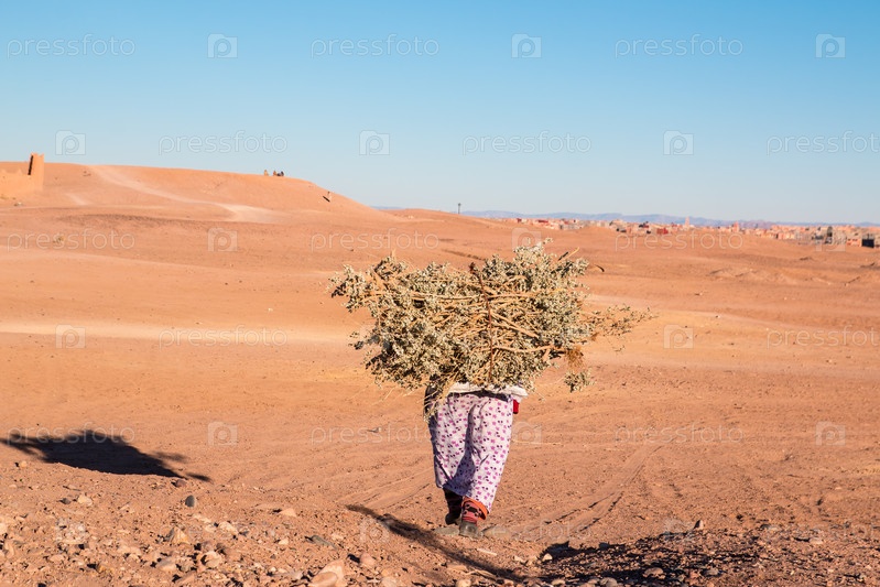 Одинокая женщина с хворостом в пустыне Марокко