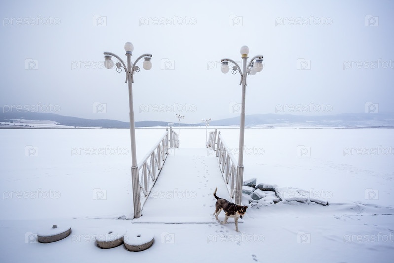 Собака около зимнего озера