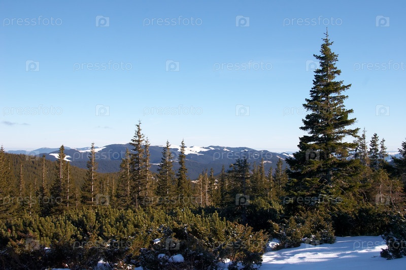 Сосновый лес на зимней лыжной поездке в Карпатах (Карпаты), Украина