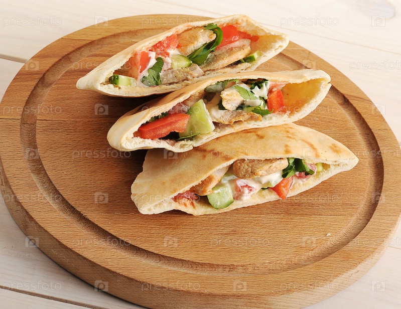 Лепешки пита с куриной грудкой, овощами и соусом