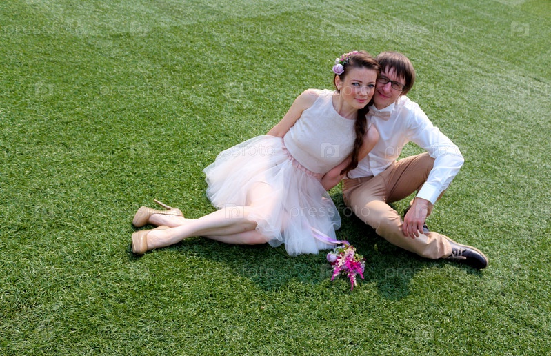 Молодожены сидят на зеленой траве