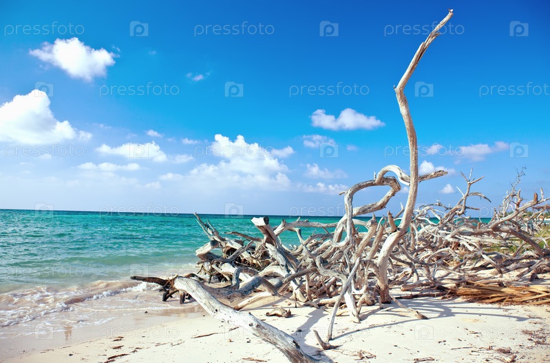 Песчаный пляж с сухими ветками