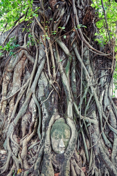 Каменная голова Будды в окружении корней дерева в храме Ват Пра Махатха, Аюттайя, Таиланд