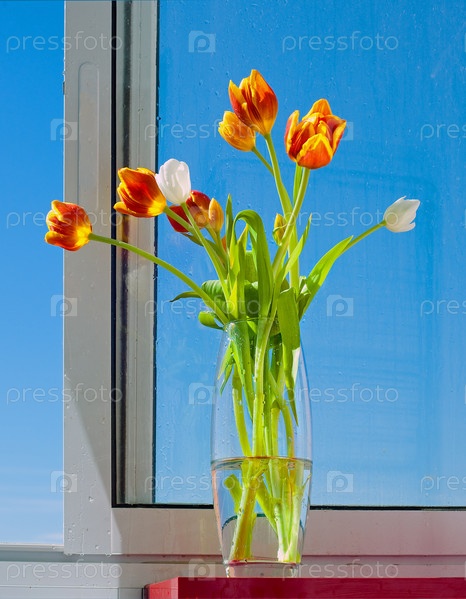Букет красивых оранжевых тюльпанов на окне