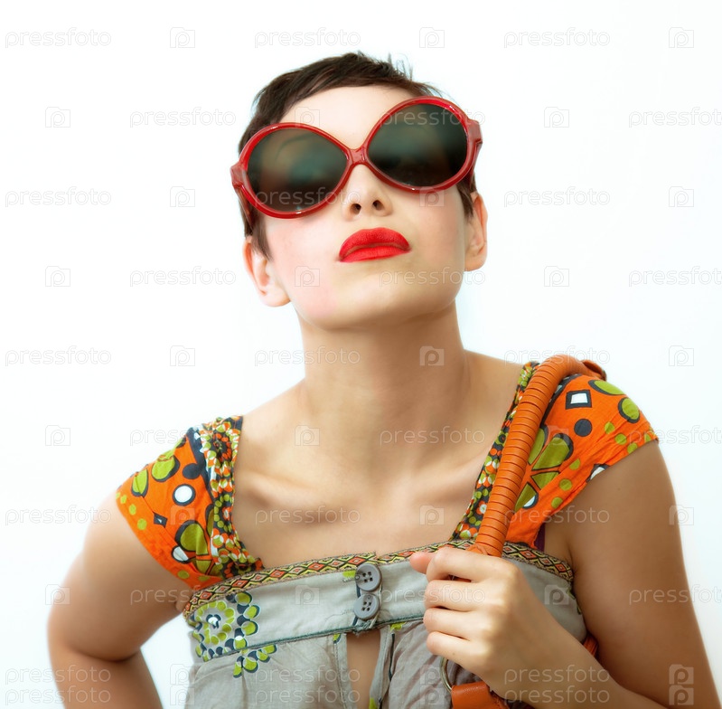 Девушка в солнцезащитных очках и с сумкой на белом фоне