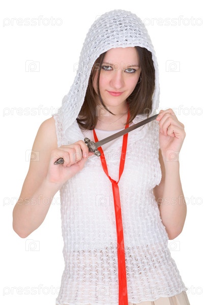 Портрет красивой девушки с кинжалом в руках на белом фоне