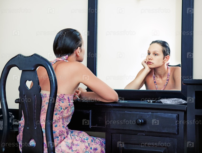 Женщина смотрит на себя в зеркало