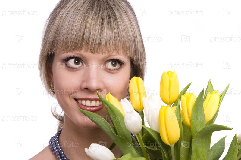 Женщина с цветами. изображение счастливой блондинки с желтыми тюльпанами. весенняя красота. красивая молодая женщина, держащая букет тюльпанов на белом фоне