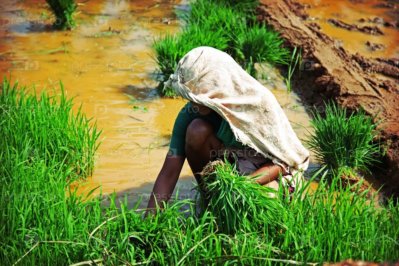 Индийская женщина занимается посадкой риса