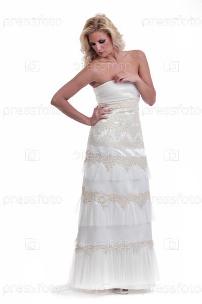 Красивая молодая невеста в свадебном платье в стиле ретро на белом фоне