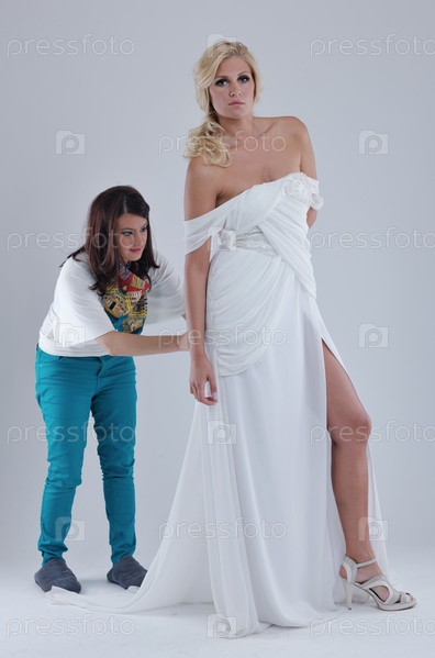 Модельер подправляет платье невесты