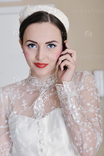 Красивая молодая невеста в говорит по телефону