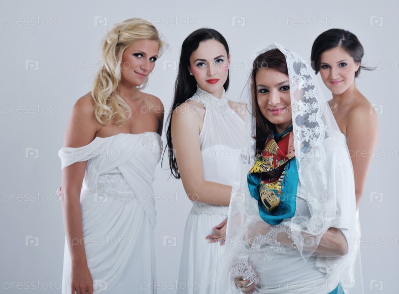 Модельер и три модели в свадебных платьях