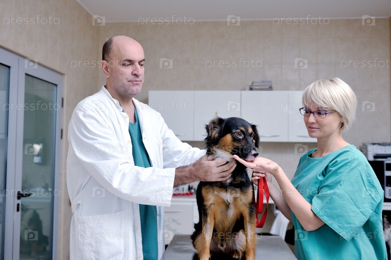 Ветеринар и его ассистентка осматривают собаку