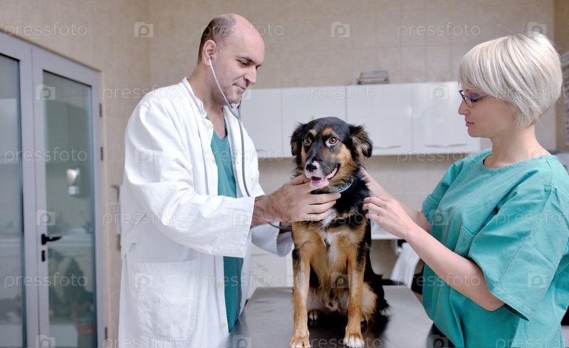 Ветеринар и его ассистентка осматривают собаку