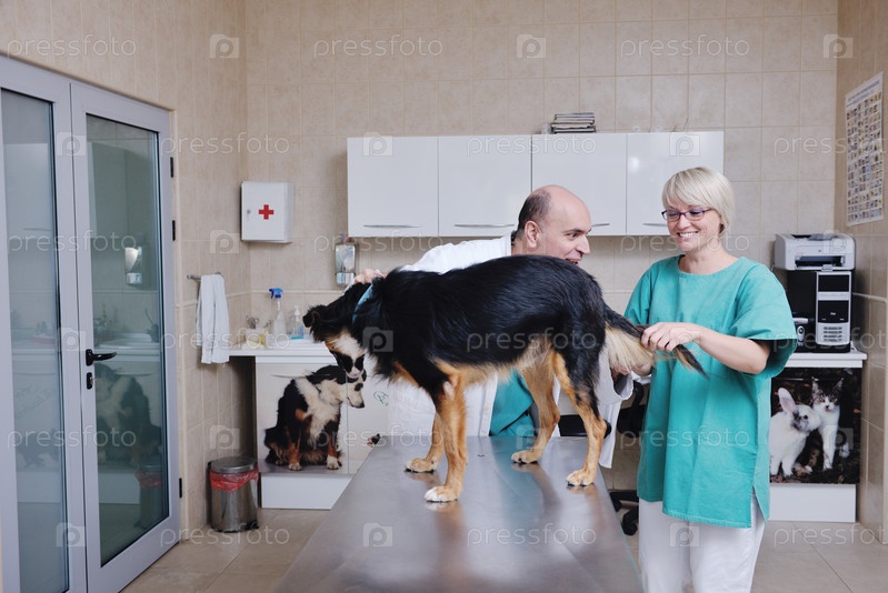 Ветеринар и его ассистентка осматривают собаку